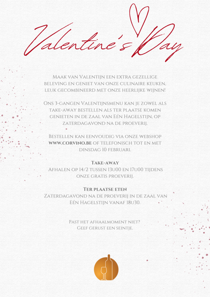 Ons 3-gangen Valentijnsmenu kan je zowel als takeaway bestellen als ter plaatse komen genieten. Takeaway bestellingen kunnen afgehaald worden op 14 februari tussen 13u00 en 17u30 tijdens onze gratis wijnproeverij. Dat is meteen het ideale moment om al een glaasje te proeven en inspiratie op te doen voor de avond.